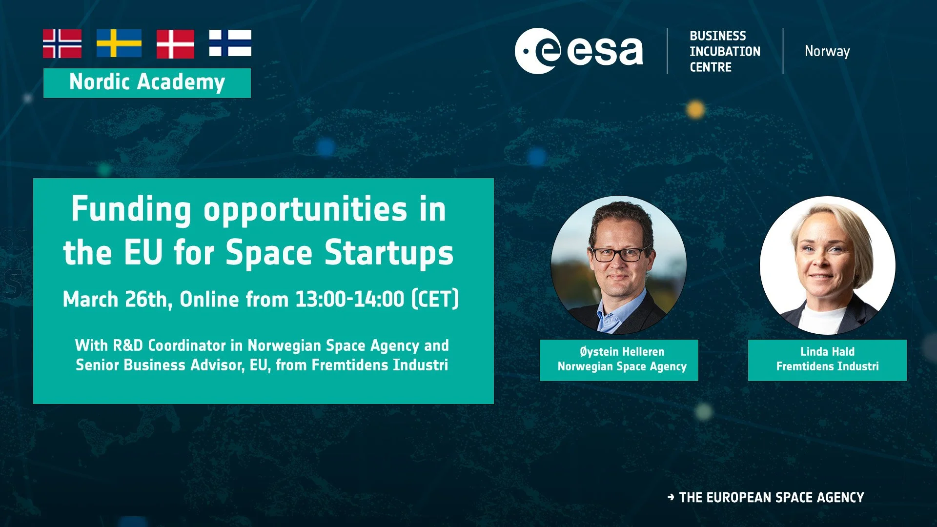 Nordic Academy is a webinar series designed to strengthen the competencies of startups and alumni in the ESA BICs across Sweden, Denmark, and Norway. The series features quarterly sessions focused on key topics relevant to these companies. The Nordic Academy is organized in collaboration with the ESA BICs in Sweden, Norway, and Denmark.